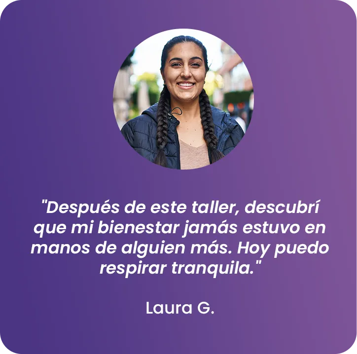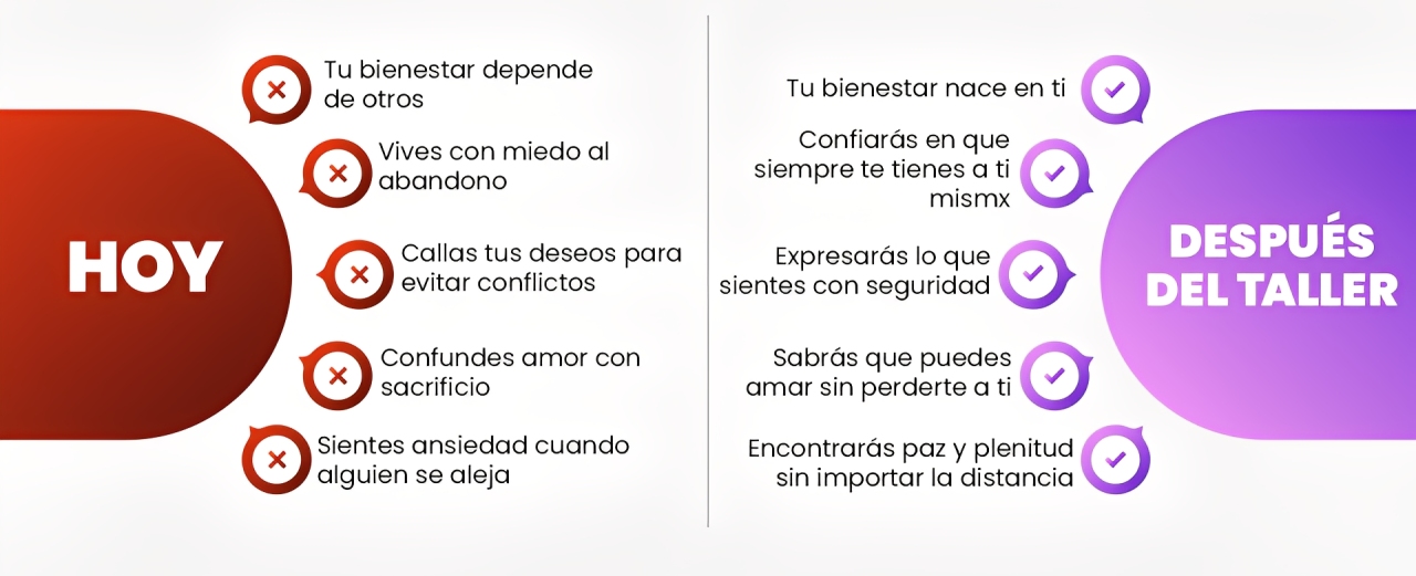 Al completar este taller te sentirás libre y dejarás de vivir satisfaciendo las necesidades de los demás en tus relaciones de pareja, familiares, laborales y con amigos, por el miedo a que te abandonen.