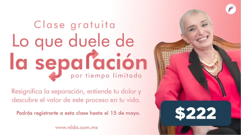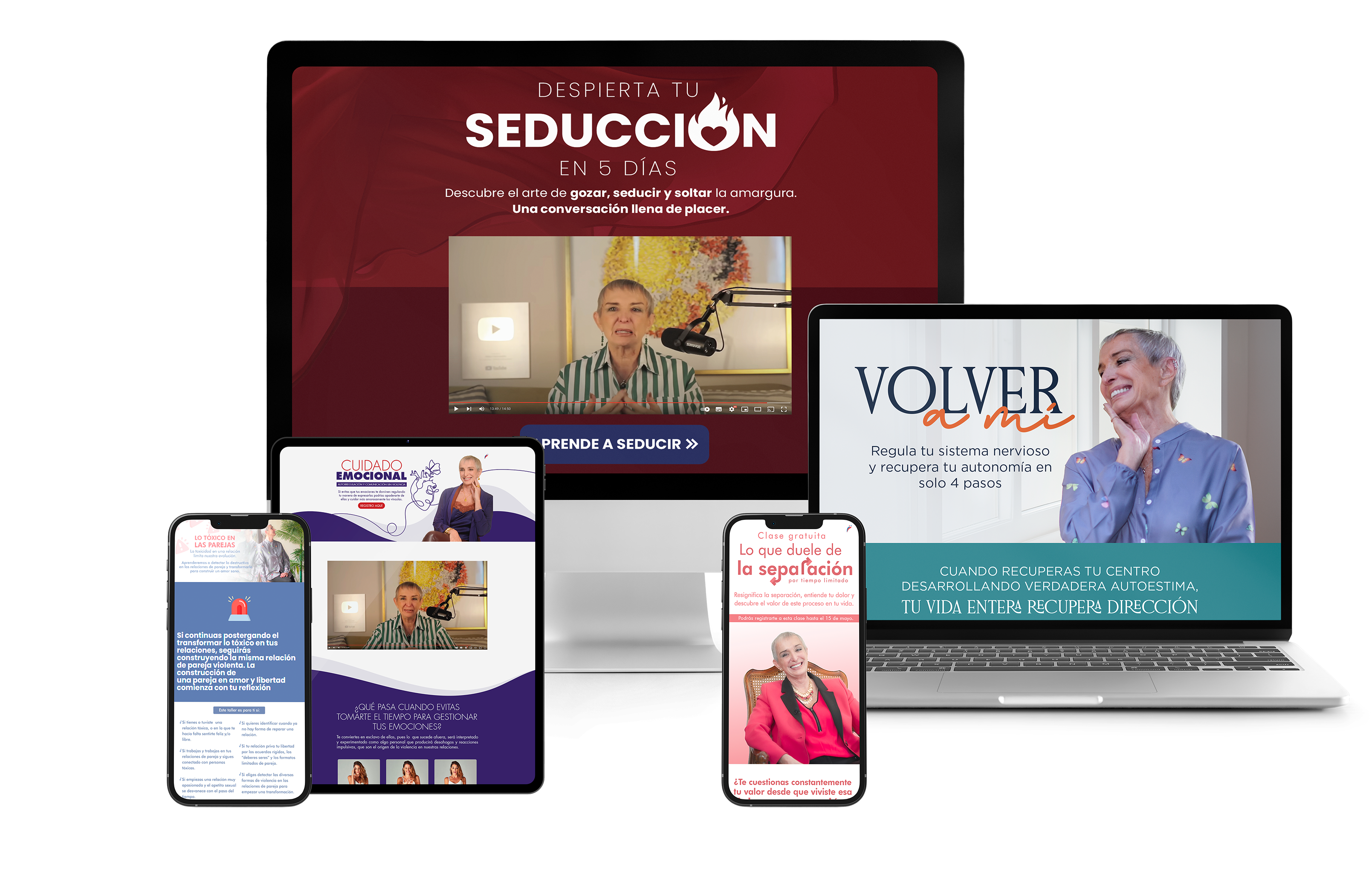 5 cursos on-demand: Despierta tu seducción, Cuidado emocional, Lo tóxico en las parejas, Lo que duele de la Separación, Volver a mí después de la separación.